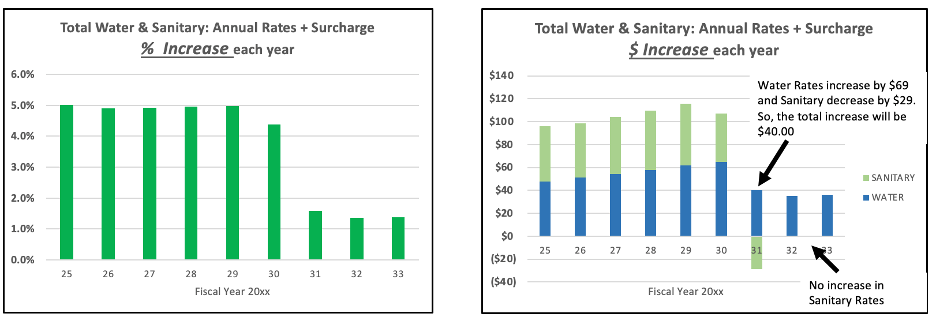 4. Rate increases for the next 10 years, Combined Water and Sanitary rates + surcharge, are projected as: